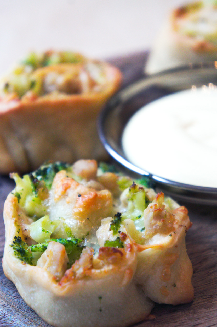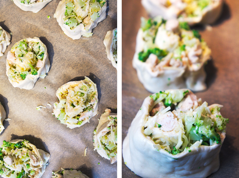EN // Roll out the pizza crust and spread on the sauce hollandaise. Top with chicken, broccoli and cheese and roll it up longways. Cut it into slices and bake it for 15 till 20 minutes (220°C).