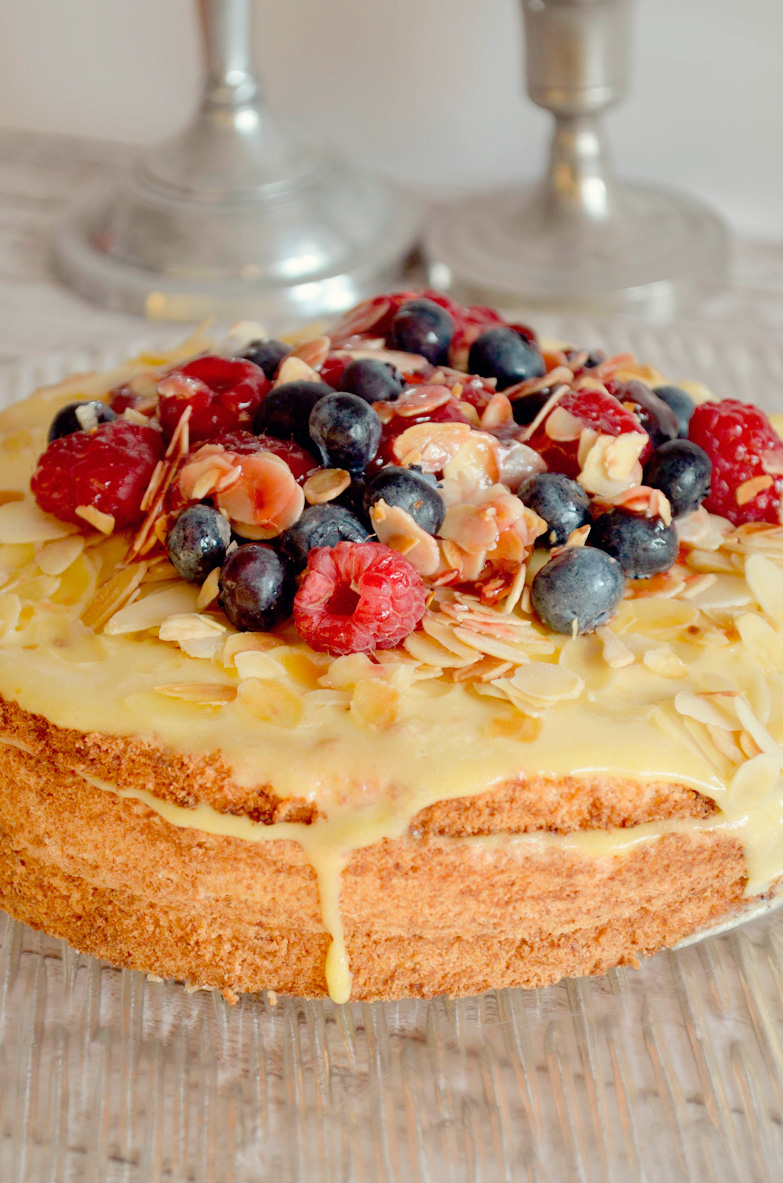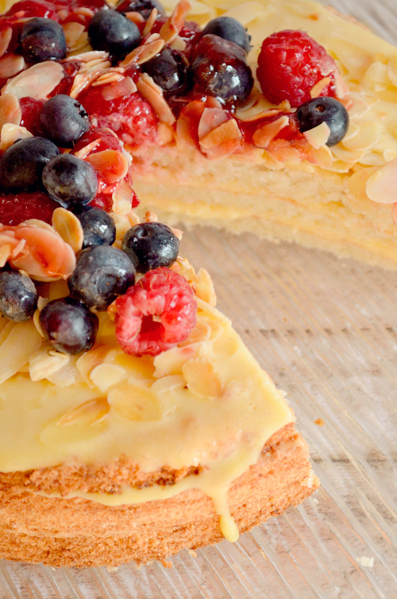 Kurz vor dem Servieren mixt ihr die verbliebenen Mandelblätter mit 2 EL Marmelade und den Früchten und gebt das Ganze als Topping auf den Kuchen.