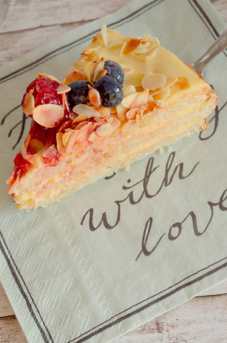 Sobald alle drei Böden gebacken und ausgekühlt sind, könnt ihr den Schmand mit einem Mixer kurz aufrühren und nach und nach unter die Eiercreme mixen. Jeder Boden wird mit 1/3 der Creme bestrichen, bevor der nächste Boden nach oben gestapelt wird. Auch obenauf noch mit der Creme bestreichen und mit den Mandelblättern bestreuen. Lasst euch ca 1 EL Blätter übrig und dann muss der Kuchen erstmal kalt gestellt werden, damit die Creme fest wird. 4 Stunden sind gut, am Besten aber über Nacht.